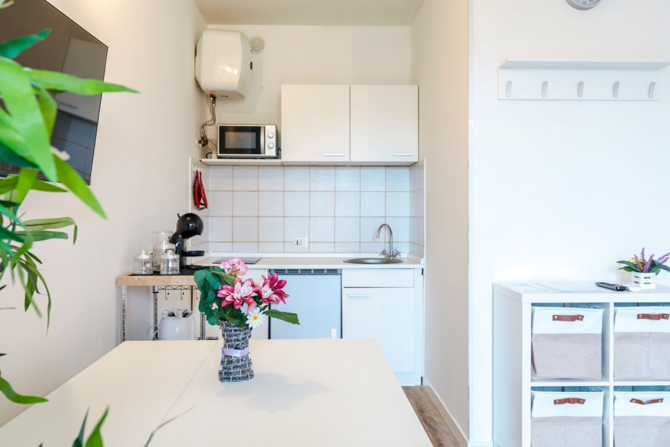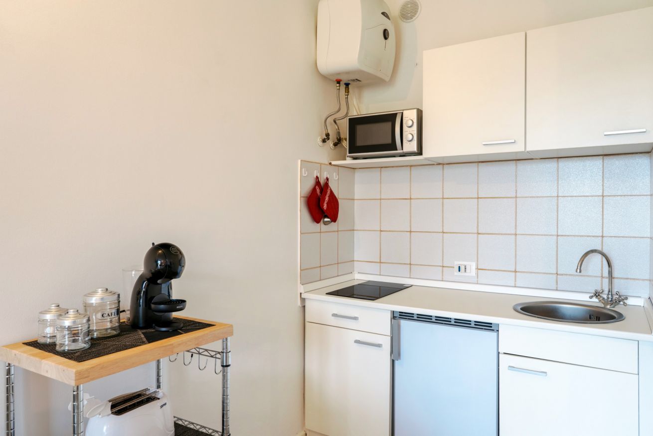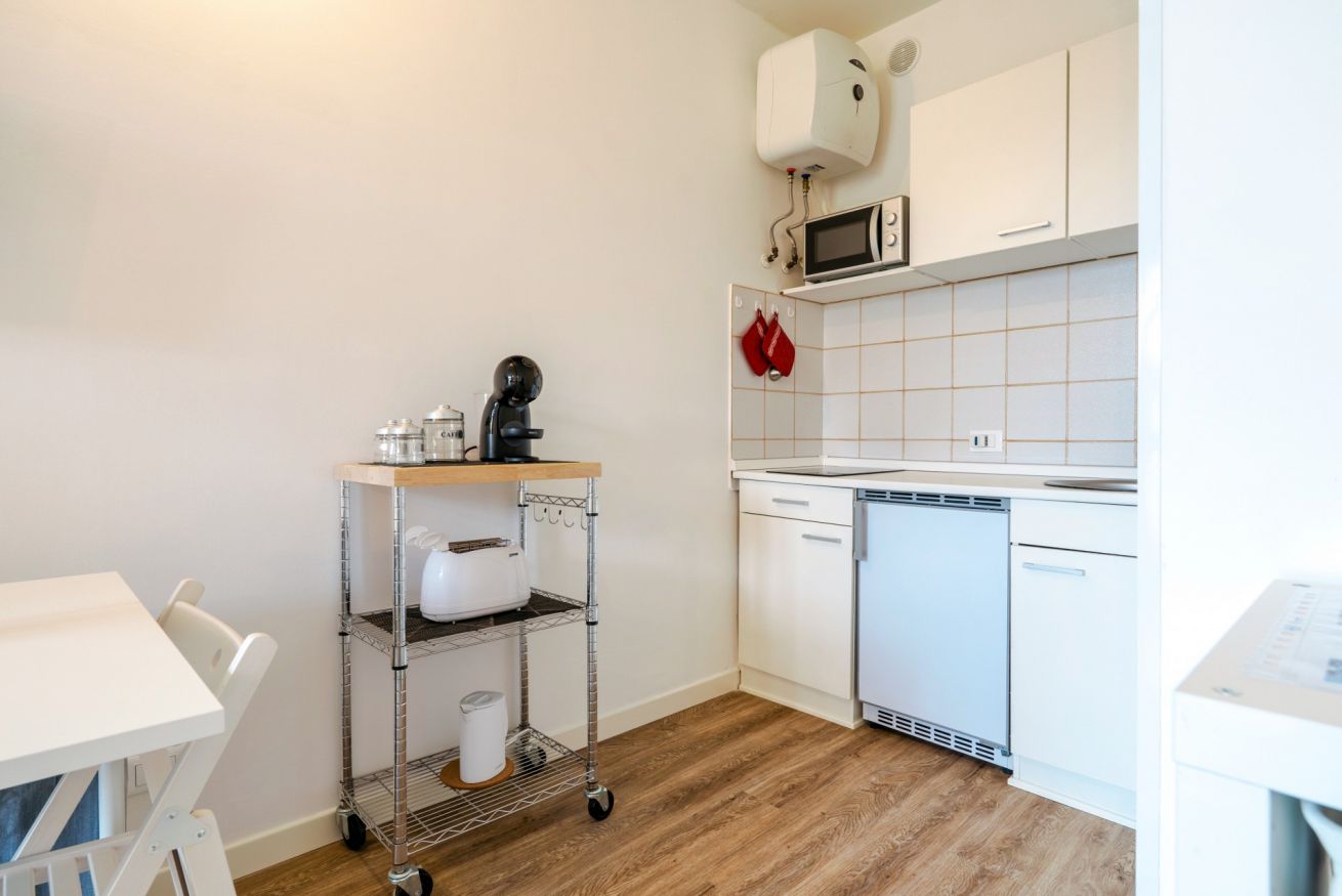 Tra le dotazioni troverete: aria condizionata, forno microonde, macchina per caffé mod. Dolce Gusto, piccolo frigo con freezer, bagno finestrato con doccia.